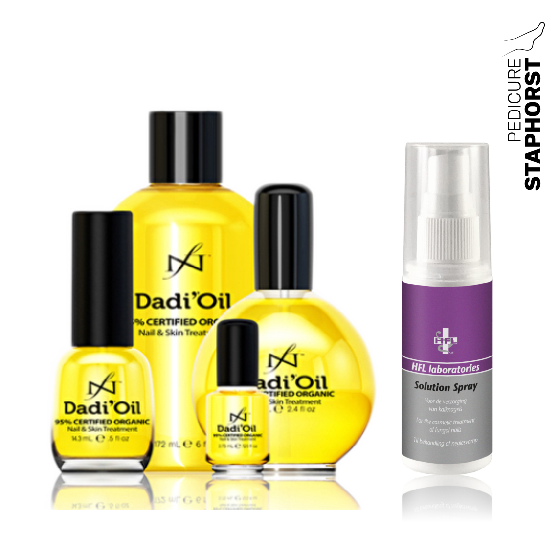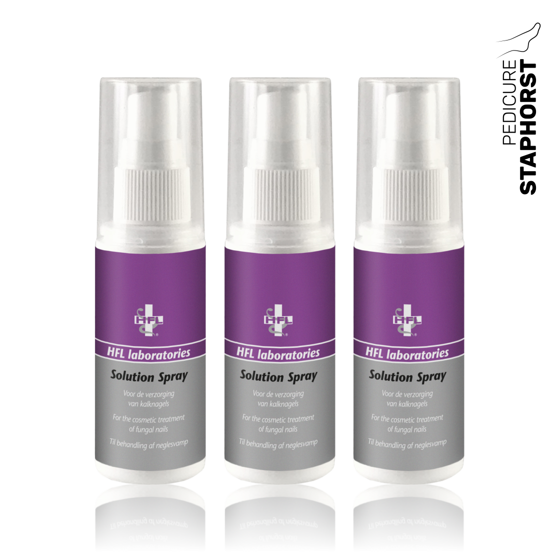 HFL Laboratories gepatenteerde Solution spray is hét product voor de cosmetische verzorging van kalknagels die vaak verkleurd of broos zijn. Mede kan de spray gebruikt worden op de huid. Bijvoorbeeld wanneer men de voeten of huid niet goed heeft afgedroogd na het douchen of zwemmen en de huid dus erg rood en gevoelig is geworden. De spray maakt de huid en nagels goed schoon, verzorgt kalknagels, de rode gevoelige huid en bevat tevens verzorgende bestanddelen.